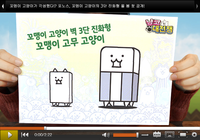 포노스 주식회사는 1일, 자사에서 운영 중인 스마트폰 게임 냥코대전쟁의 한정 캐릭터「꼬맹이 고양이」의 3단 진화형을 올 봄에 처음 공개한다고 밝히고 긴급 기자회견을 열었다.